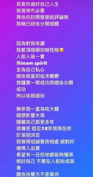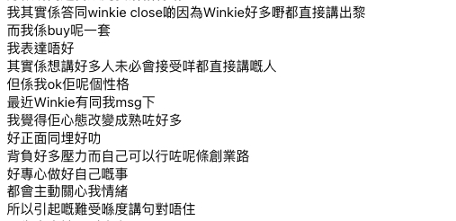Winkie表示不能再忍受另外兩位前隊友消費自己:「得閒就喺電台講吓」她擔心的是,日後若自己的小孩、學生看到報導,自己又該如何解釋清楚自己的委屈。Winkie現在已經Block了她們的聯絡方式:「只係唔好彩遇到呢班人」