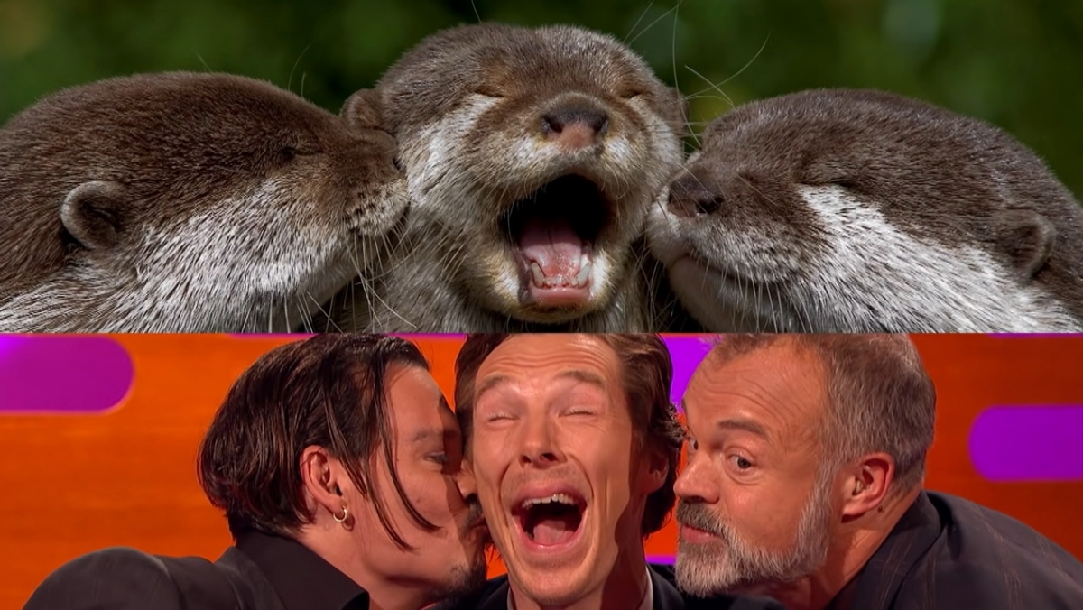 起初要班尼模仿的水瀨都還算正常,後來一些扭曲的水瀨表情,班尼也跟著面容扭曲,超級爆笑!更有一張是三隻水瀨貼在一起的照片,一旁的Johnny Depp也逃不過,更意外獻吻班尼,令觀眾忍俊不禁~