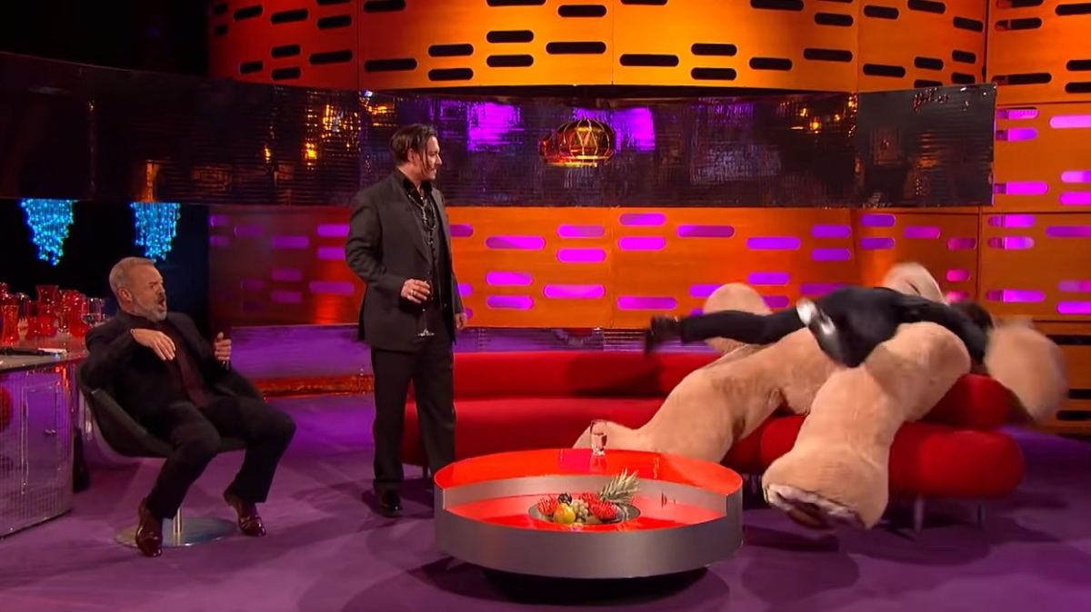 最後節目組更搬出巨大熊公仔做道具,如此少女心的照片,令班尼拍完後直接惱羞成怒,不但飛撲過去,更假裝打熊公仔,其後Johnny Depp還加入欺負熊公仔,互動超可愛!