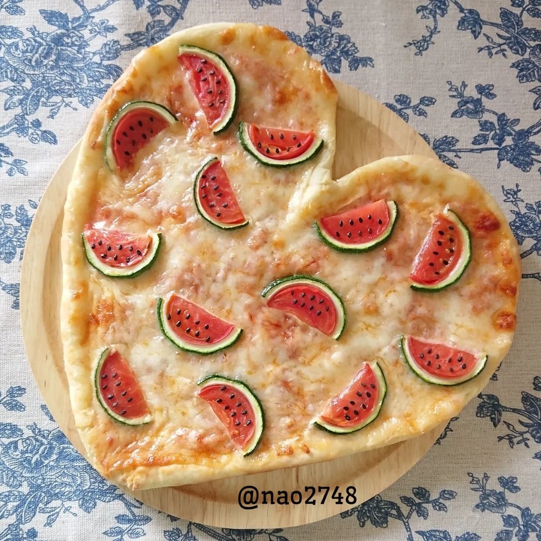 剛好最近炎炎夏日,Nao就利用小蕃茄來創作出西瓜和小甲蟲圖案的Pizza~瞬間涼意大增!