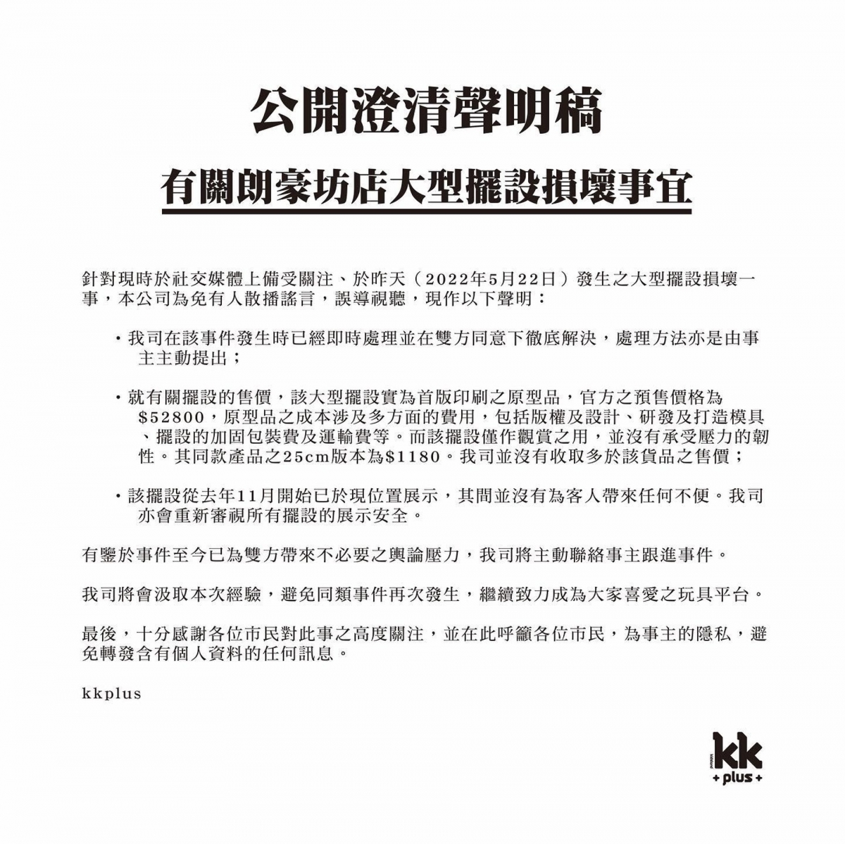 事件在網上引來很多的聲音,玩具店在官方FB發出聲明澄清,指事件是在雙方同意下已經徹底解決,處理方法是由事主主動提出,又指該大型擺設僅作觀賞之用,所以並沒有承受壓力的韌性。對於售價問題玩具店指是首版印刷之原型品,官方預售價格為$52800,當中成本涉及多方面費用,包括版權及設計、研發及打造模具、擺設的加固包裝費及運輸費等。