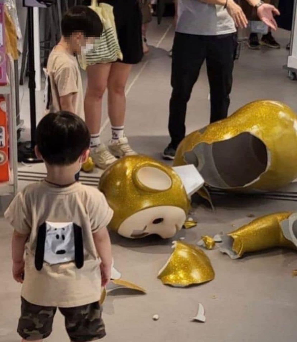 涉事男童的媽媽事後在fb發文,指出原來當時自己在看其他東西,沒有留意到事發情況,突然聽到一聲巨響,回頭已就發現公仔倒地,店員更是向家長表示是男童將公仔踢倒,之後他們就選擇即時賠錢,但他們與兩個兒子都嚇呆。事主爸爸透露小朋友回家後,不斷問「點解個公仔咁恐怖」,相信小朋友已經留下心理陰影。