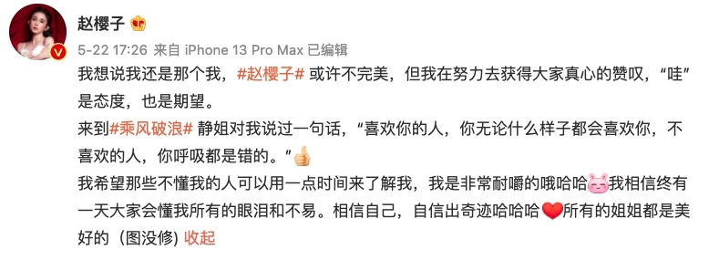 而且又指出趙櫻子亦有在微博上傳Live照片,她亦特意留言表示自己並沒有修圖,大讚其他姐姐們都很美,在照片中她們的感情看上去很好。