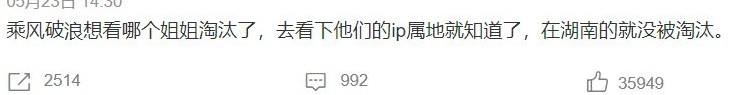 微博近月開始公開發文者的IP地址,也就是能知道發文者身處的地方是那裏。《乘風破浪》的拍攝地點是在湖南,因此網友表示,只要看看哪位參賽者微博發文IP不是在湖南就代表很大機會被淘汰了。網友們紛紛高呼:「沒想到被微博劇透了啊!」、「微博你欠我的神秘感拿什麼玩」,同時也驚嘆網友的聰明。