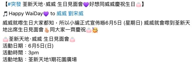 日前有商場就宣布在6月5日為阿威舉行生日見面會,憑入場證參加生日見面會的會員,可以即場同威威合照,又可以近距離接觸玩遊戲。由於商場消費100蚊就有1點數,只要消費300元就可以獲得與阿威合照的機會,但今次活動就引來部分粉絲的不滿。