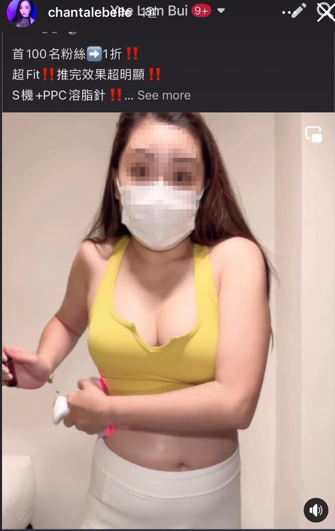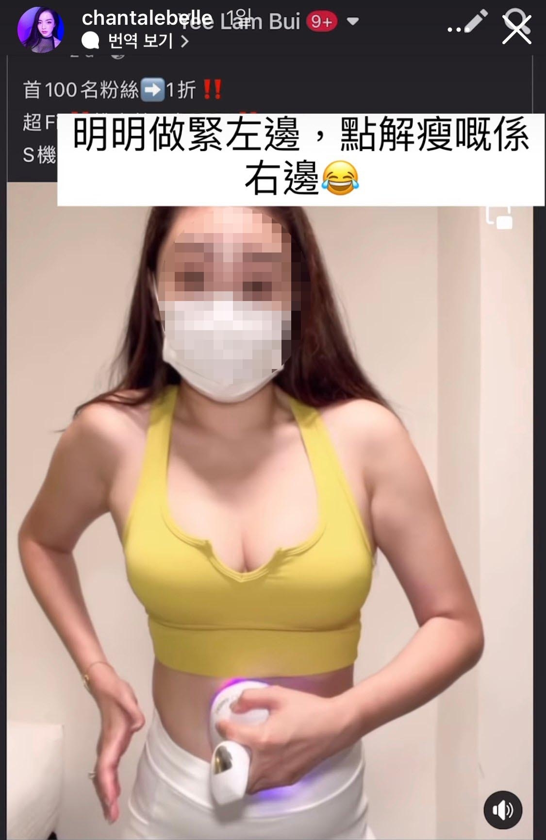 之後Chantale又上傳了另一段實測溶脂機的影片,指出一位身穿黃色背心的女士,正在用溶脂機實測右邊的肚子,但下一秒居然反正是左邊的肚子變瘦,就連手臂被拉到變形,質疑「明明做緊嘅係右邊,點解瘦嘅係左邊?」相信同樣是用P圖來塑造出瘦身的效果。