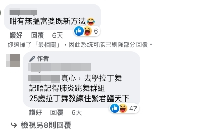 貼文下面亦有男士搞笑留言,詢問樓主有沒有認識富婆的方法,樓主就叫他去學跳拉丁舞再做拉丁舞老師,相信同樣可以認識到有錢女人。