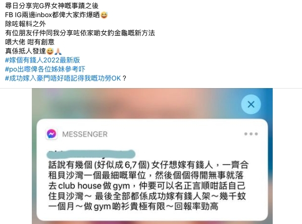 該網民提到由於是多人合租,每個女生只需一個月幾千元的租金,相信比住劏房還便宜,漂亮的運動服的價格也不會太高,是一個低成本卻很有效的方法,而且該幾位目前都成功嫁給有錢人。