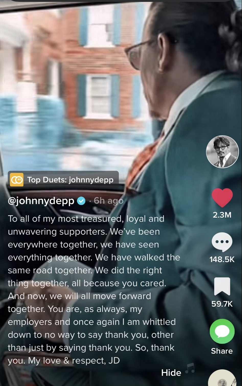 而Johnny於Tiktok發佈的第一條片剪輯了他在車上向粉絲揮手,支持者在法庭外聲援他,以及他擔任Jeff Beck演唱會嘉賓時的表演畫面等等,表示會與支持者繼續一起「向前」。