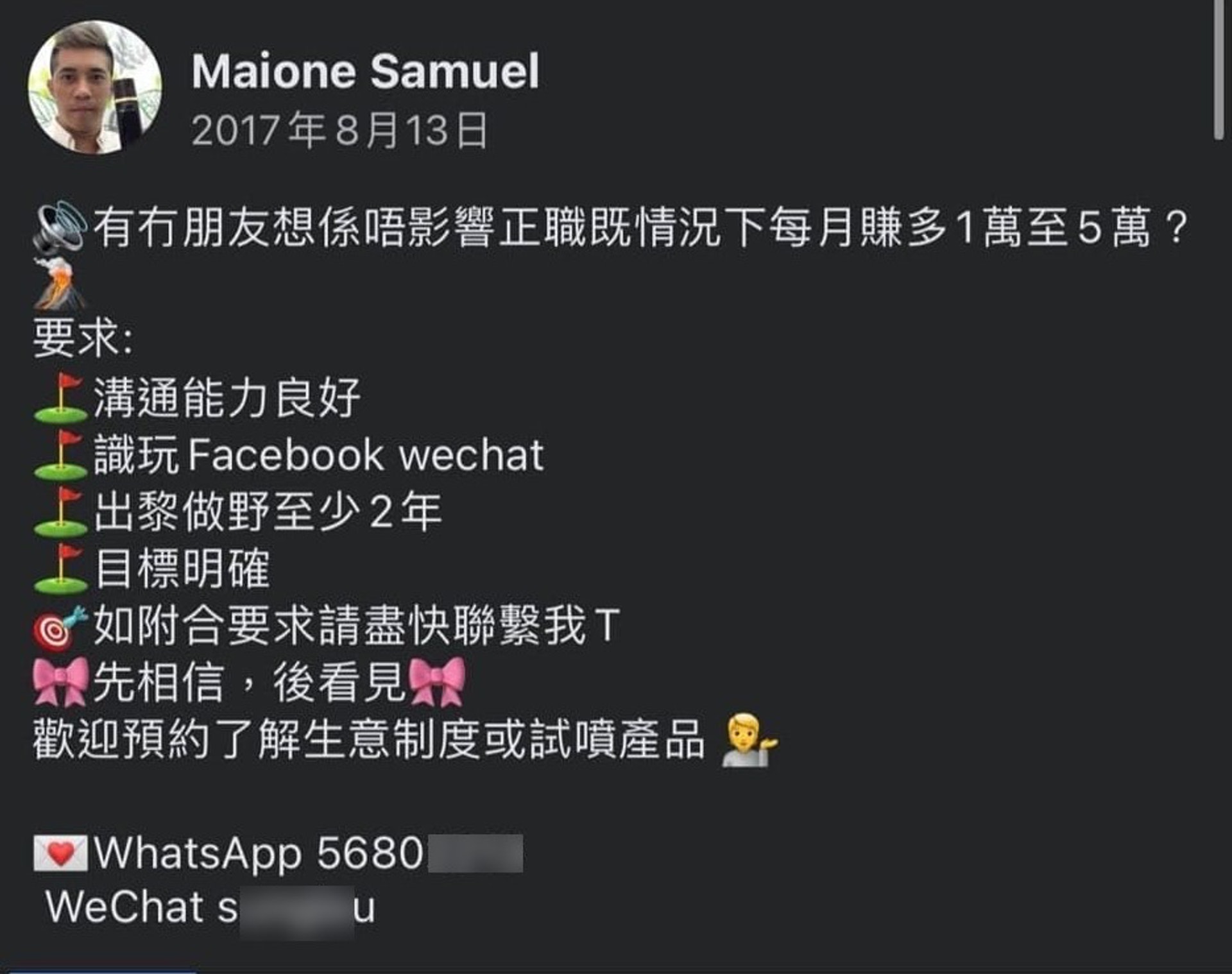 但近日突然有網民爆料威威並不是一直做豬肉分割員,疑曾經做過「呃人」傳銷?2017年就有在FB上宣傳過「MAIONE」的美容產品,網民更附上疑似招攬人加入團隊「搵外快」的廣告。