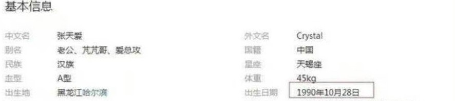 現在在百度百科中,張天愛的年齡直接只顯示生日月份和日期,不過最讓人疑惑的是,改年份就算了,就連三次生日的月份和日期都不一樣?!有人查閱她剛出道時的雜誌資料等,都指她是1988年出生的,因此大多網友都偏信她如今33歲~其實就算是30路,張天愛也算Keep得不錯,大家覺得呢?