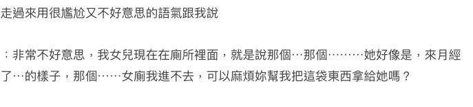 台灣一名女網友近日在Dcard的討論區中分享,自己在路上看到一位先生在女廁門口很焦慮的走來走去,當看到女網友的時候就上前求救。原來那位是單親爸爸,很尷尬地請求女網友進女廁看看自己的女兒,因為女兒第一次來月經,自己又進不去,並拜託樓主將剛買的衛生棉拿給女兒。