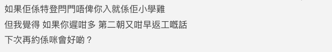 到達男友家的她,卻一直等不到男友開門給她:「㩒極門鐘都唔應門,我就企喺佢屋企門口,打咗百幾次比佢都唔聽!我第日要返工,9點要起身,佢就鎖我喺出面!」樓主還強調與男友分別住在天水圍和寶琳,因此自己是山長水遠去男友家的。