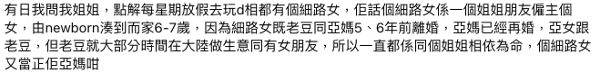 原來小女孩是外傭朋友帶出來的,她的朋友同樣也是從事外傭行業,而小女孩則是她僱主的女兒。現在只有6歲多的小女孩,並沒有雙親的照顧,早在她不足1歲的時候,父母就已經離婚。如今母親已經再婚,而小女孩則是跟隨父親生活。