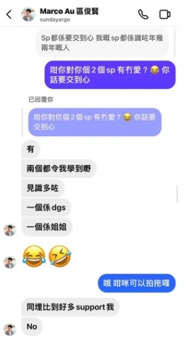 女友才醒覺原來對方並不喜歡自己,因此雖然捨不得,但還是分手了。她更爆出分手後不足兩星期的對話,能看到對方對話用的就是官方IG帳號。原來分手後不久,Marco就已經找到了兩個SP,甚至其中一個還疑似中學生!