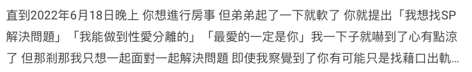 2022年6月尾,女友經朋友開解後,覺得應該有其他比較好的方法解決男友的「有心無力」,就鼓起勇氣提議男友,不如兩個人再自己努力一下,若是也不行才考慮找SP。結果Marco立刻反目大罵:「為什麼你不明白 就是要找SP才能解決!」還說:「你想一下我出去找完SP 我回來會內疚的 那我只會更內疚地愛你 」