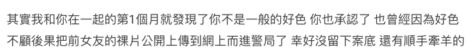 結果才拍拖一個月,女友就已經發現Marco非常好色,甚至本人也承認了曾因為好色而不顧後果,將前女友的不雅片段上傳到網上,還因此進了警局,還有疑似順手牽羊的事件。不過當時女友認為他已經改過,而且坦白從寬,就沒有再提起事件。