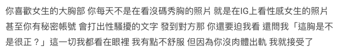 拍拖期間,女友指Marco每天都在看其他女生的性感照片,還會用副帳私信那些女生,說性騷擾的話。甚至強迫女友看那些照片:「這胸是不是很正?」她還爆出雙方第一次發生關係的時候,Marco偷偷不做安全措施,事後解釋因為會影響「表現」,要女友吃事後避孕藥。當女友因為吃完會情緒不好而抗拒的時候,Marco還自稱快要出差,因此會長時間見不了面,哄她吃下。