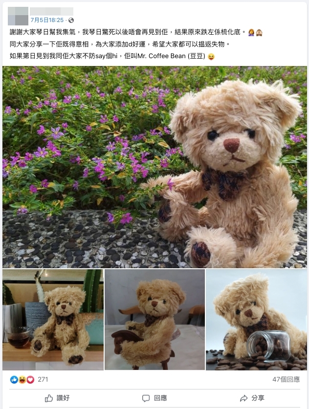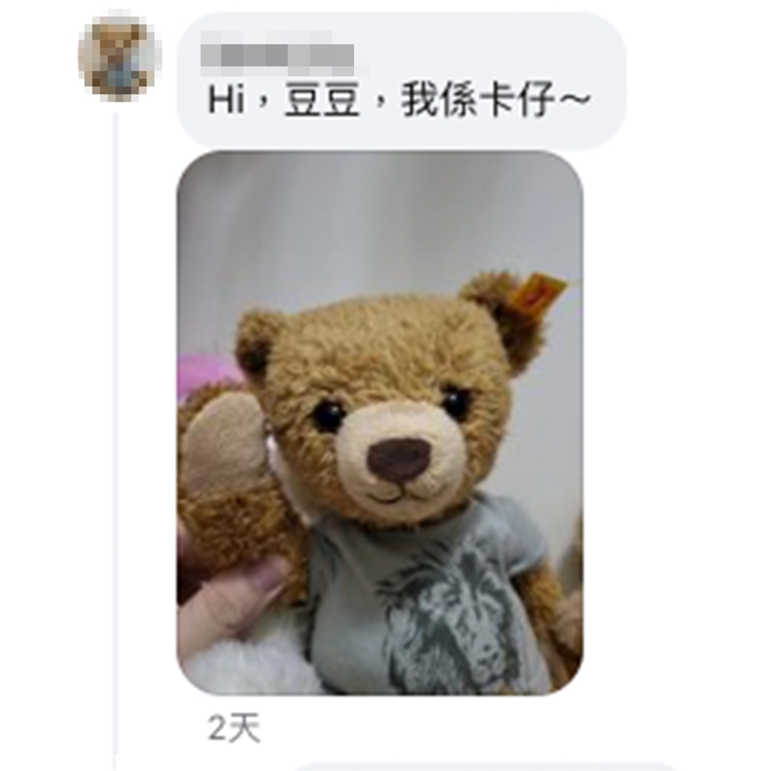 女網民在Facebook群組「香港失物報失及認領群組」發文,表示不見了隻忌廉色的熊公仔,請街坊們幫手尋找。帖文中夾雜多個哭喊的表情符號,表示該隻熊公仔經常陪她「出去同小朋友補習,d小朋友都好鐘意佢」,更表示自己有時心情「唔好又會拎佢陪住我出街返工返學」,可見隻熊公仔在她心中佔有舉足輕重的地位。