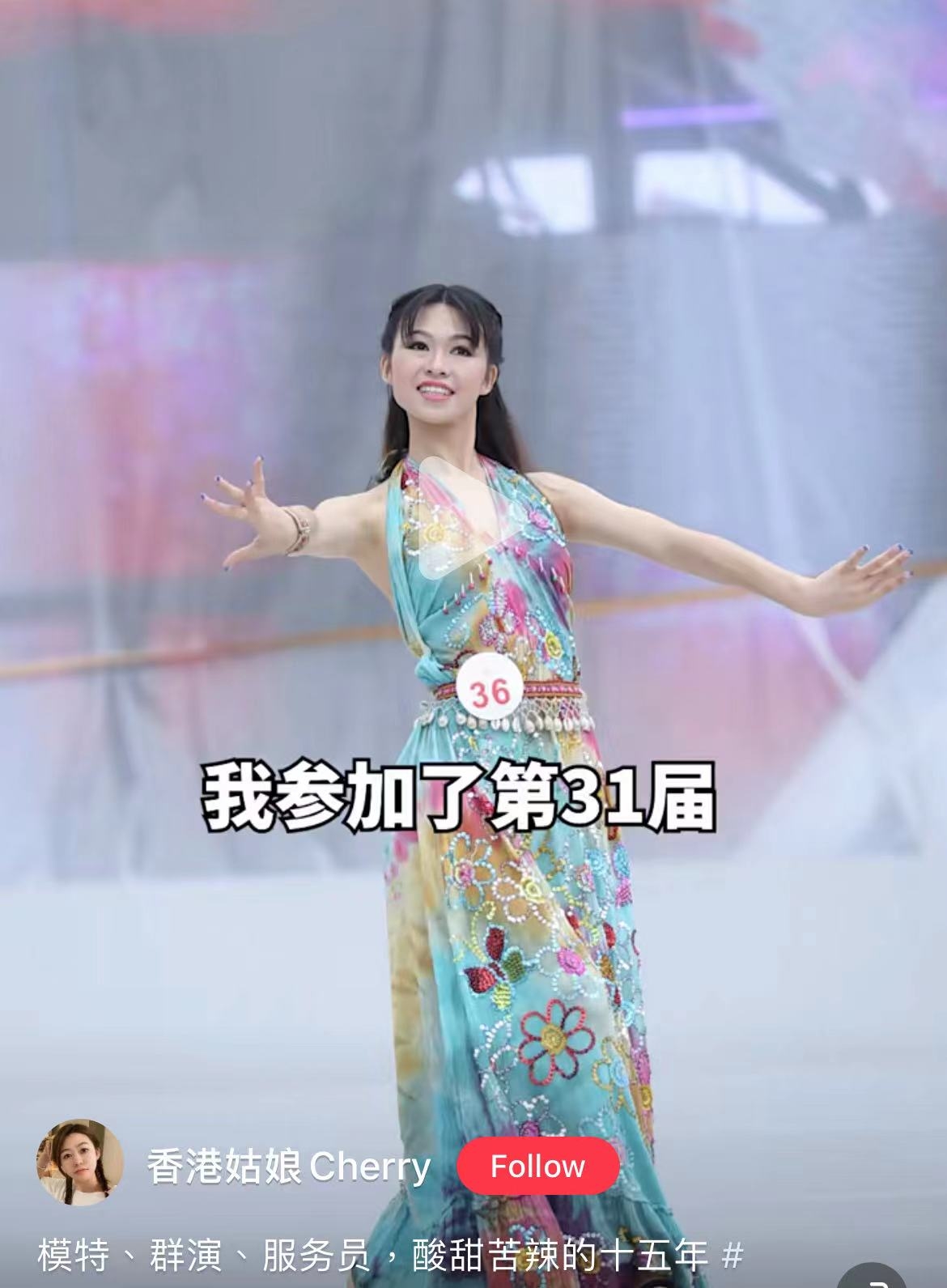 Cherry 在小紅書社交平台分享昔日照片,早已參加過很多比賽, 更奪得第31届中國全球城市旅遊小姐世界大賽最佳才藝獎。