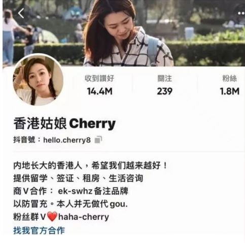 Cherry在抖音自我介紹:「內地長大的香港人,希望我們越來越好!」上載了約300多條vlog, 以香港為主題, 介紹內容包括「香港的衣, 食, 住, 行」、「在香港的生活費水平」、「讀大學是種甚麼樣的體驗?」、「香港人小時候吃甚麼零食」等等