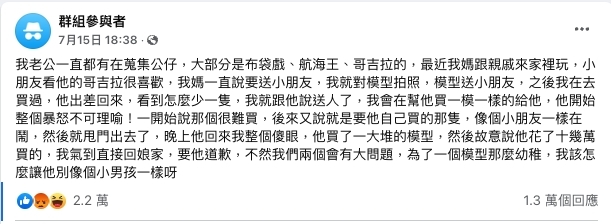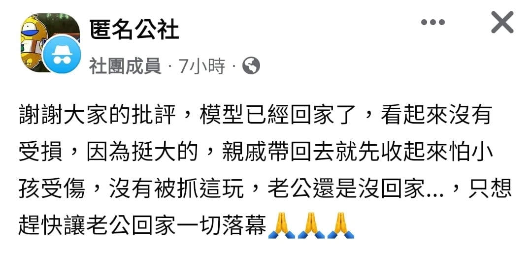 台灣有一名人妻在網上自爆將丈夫的模型送給了親戚的小孩,還指責丈夫太小氣,結果被網友一致責罵很自私。人妻表示丈夫一直有收集公仔模型的習慣,近日有親戚到訪,親戚的小孩很喜歡丈夫收集的哥斯拉模型,人妻的母親則自把自為說要送小朋友。結果人妻對模型拍照,想著日後買回一隻給丈夫,就擅自將模型送給了小孩。