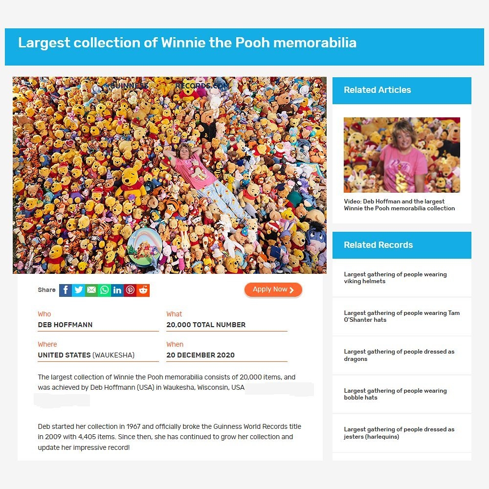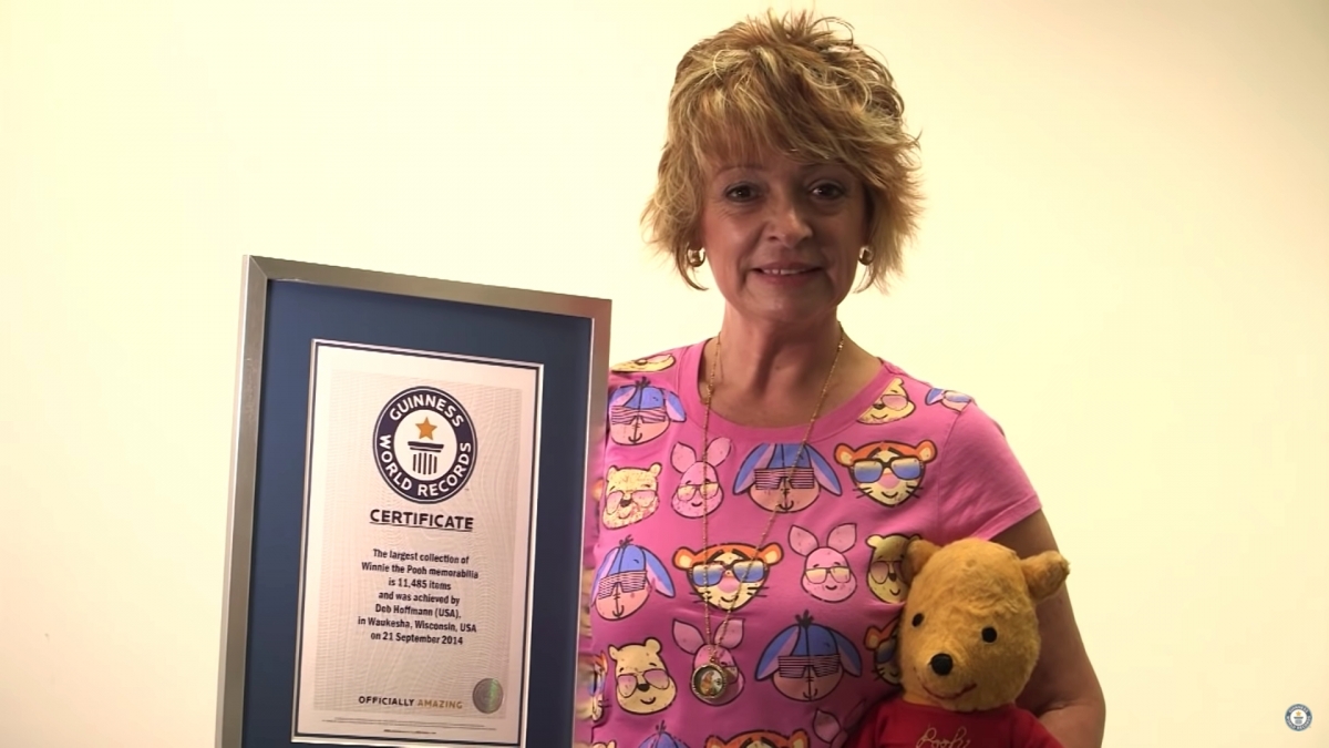 美國就有一位小熊維尼(Winnie the Pooh)的忠粉——Deb Hoffmann,不但收藏了無數隻可愛的小熊維尼公仔,還有各式各樣的收藏品,像是碗碟、手機殼、吊飾、家居裝飾、圖書等,更厲害到列入健力士世界紀錄,成為全世界最多小熊維尼收藏品的粉絲!