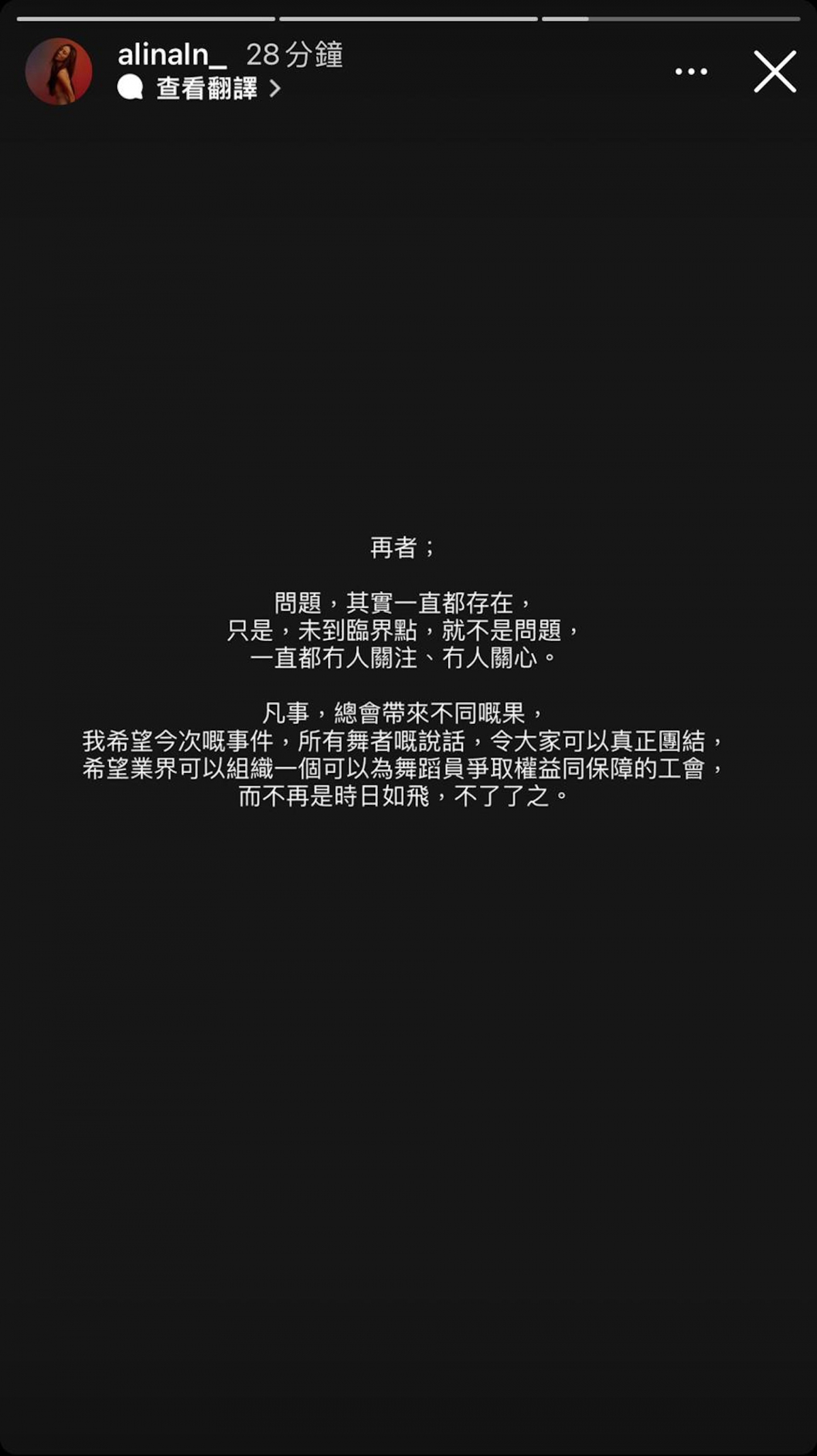 MIRROR成員Stanley(邱士縉)女友李炘頤(Alina)亦呼籲大家正視事件:「我希望今次嘅事件,所有舞者嘅說話,令大家可以真正團結,希望業界可以組織一個可以為舞蹈員爭取權益同保障的工會,而不再是時日如飛,不了了之。」