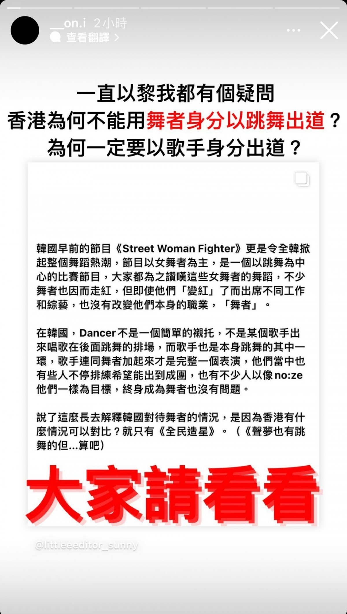 另外同樣參加《全民造星4》的WinWin在IG分享並發文,指出舞蹈員在香港未有受到應有尊重,她表示在香港大家會形容dancer做伴舞、襯托,甚至是「後面嗰啲」,但她卻表示dancer本身是一個Artist,又指出舞者本應就能以跳舞自居。又問在香港為什麼不能以舞者出道,一定要以歌手出道,又指在外國的舞者受到大眾尊重。