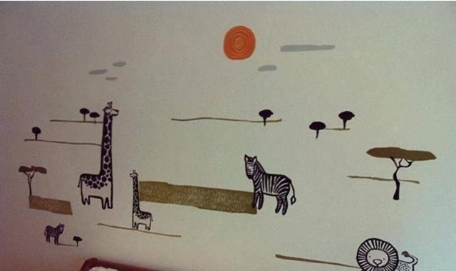 在孩子用的房間,可見孫燕姿在牆上貼上動物的牆紙,有長頸鹿、斑馬、獅子,每隻都以黑、白色的簡單線條畫成,另外,草地的描繪也是用一條線畫成,非常簡約,但也不失童趣。