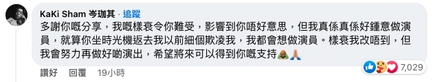 貼文上傳後有不少網民留言力撐岑珈其,當中岑珈其也有留言回應惡評「多謝你嘅分享,我嘅樣衰令你難受,影響到你唔好意思,但我真係真係好鍾意做演員,就算你坐時光機返去我以前細個欺凌我,我都會想做演員。樣衰我改唔到,但我會努力再做好啲演出,希望將來可以得到你嘅支持」岑珈其的留言被網民大讚大方,又力撐珈其的演技及努力很值得欣賞。