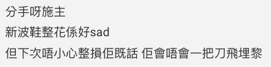 不少網民看過樓主的貼文後,紛紛指出樓主男友應該是「恐怖情人」,勸喻樓主早日離開男友,又指「今次係珍珠奶茶,下次可能係刀」、「睇嚟得鞋比女友重要」、「控制不到自己情緒的男人要不得!」等等~