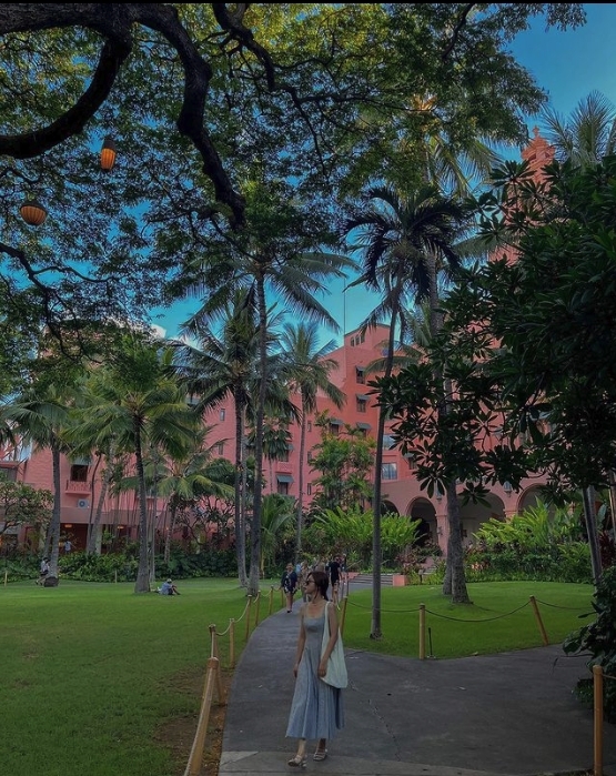 夏威夷的歐胡島(Oahu)的威基基海灘(Waikiki)附近有不少的酒店,其中最突出的是一家全是粉紅色的酒店。除了外牆是粉紅色之外,它的沙灘傘和房間都是粉紅色的,簡直是粉紅色的天堂!