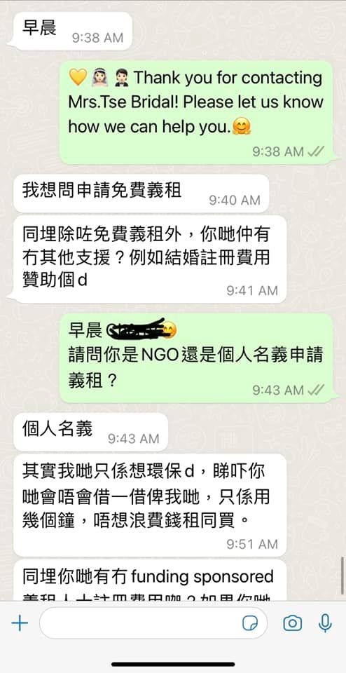 從截圖中可見,有位準新娘向婚紗店表示想申請免費義租婚紗服務,又問道「除咗免費義租外,你哋仲有冇其他支援?例如是結婚註冊費用個啲」於是店主就向對方詢問「請問你是以NGO還是個人名義申請義租?」