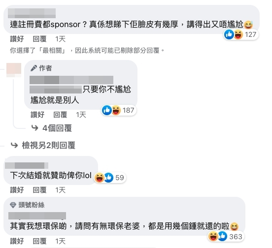 貼文隨即引來大批網民留言,網民都指這位準新娘是貪小便宜,又留言指「我諗連安全套都要義租啦」、「真係想睇下佢臉皮有幾厚,講得出又唔尷尬」,亦有網民突破盲點「其實我反而唔明點解借衫係環保,租衫唔環保」又有紙紥舖抽水:「我哋有免費,用紙做的」