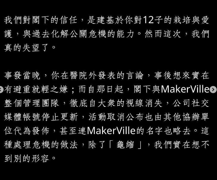 最讓粉絲們心痛的是,公司這樣的處理方法,令MIRROR 12子成為了管理層的「擋箭牌」,面對公眾:「MakerVille要旗下藝人硬擋,無疑是消耗這群年輕人辛苦得來的聲譽。鏡仔在你們眼中,就是可以隨時撤換,用完即棄的棋子嗎?」