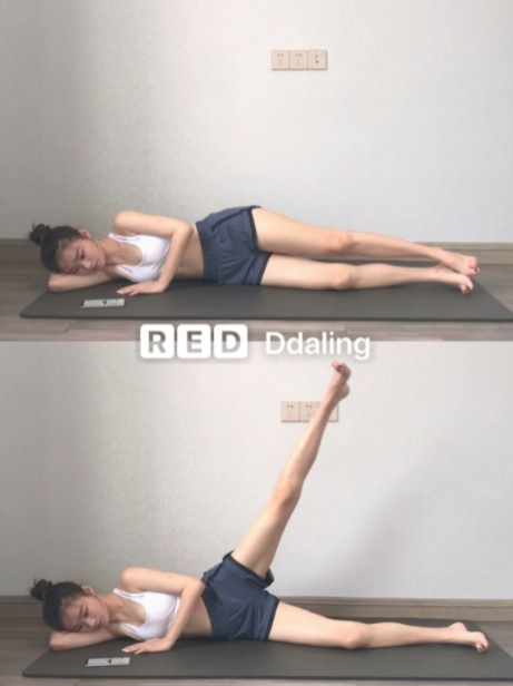 做完前抬腿後,可以做側抬腿,側臥後其中一隻腿伸直抬起,腳尖微微向下,同樣用臀部外側的肌肉發力。做完動作後,應該會感受到臀部外側酸酸的感覺。