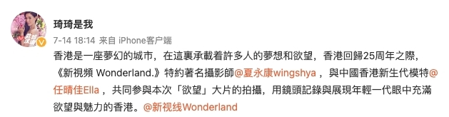 年滿18歲的Ella就被媽媽琦琦形容為「中國香港新生代模特」,宣布正式出道成為模特,又透露女兒最近與著名攝影師夏永康合作,為時尚雜誌《Wonderland》拍攝大片《欲望》展現年輕一代眼中充滿欲望與魅力的香港。