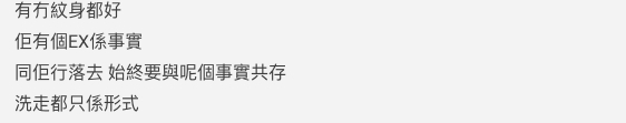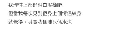 女網友更說,平常跟男友聊天,也能聽出來男友以前很愛自己的前度,甚至有時候會令女網友感覺自己並不是男友最愛的人,他依然愛著自己的前任女友。雖然理性上很理解,但是她每次看到那個情侶紋身,都會疑惑自己是否只是一個「水泡」?