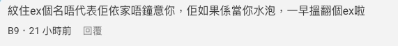 有網友認為如果男友並沒有表現出自己未忘情,只是因為紋身才讓女樓主有「水泡」的感覺,那麼就應該向男友提出問題並一起解決。有人提議如果男友願意的話,其實可以考慮「洗紋身」,或者紋一個新紋身蓋住前度的名字。有網友說:「叫佢紋埋你個名」結果被其他人反駁:「如果又分手點算」