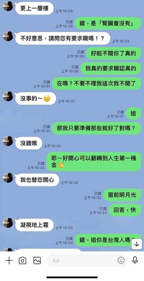 其後對方開始覺得該網民在玩耍他,不禁提問:「請問您要求職嗎?」,該網民立即強調自己是認真想求職的,並表示很開心可以賺取到人生第一桶金。不過很快他又問對方:「窗前明月光」下一句是什麼,對方回覆:「凝視地上霜」,該網民卻說「錯!是疑似八萬八」。