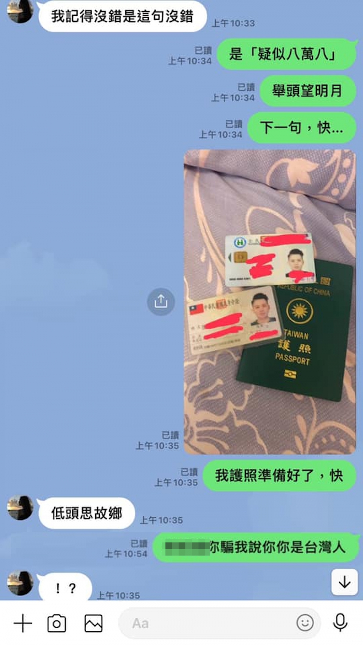 之後該網民再問:「舉頭望明月下一句」,再傳送自己的護照相片給對方,示意對方快一點:「快,我護照準備好了」,對方回覆:「低頭思故鄉」,該網民再大鬧:「你騙我說你是台灣人」、「又錯!是『器官賣光光』」。之後對方可能覺得自己被玩耍,就沒有再回覆了。