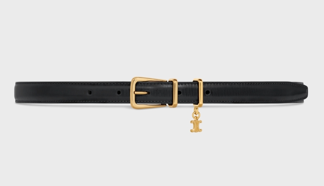 另一款新品皮帶也十分精緻,以黑色小牛皮襯上長方形的金屬搭扣,並掛有一個可愛的金色小Triomphe標誌吊飾,輕巧又不浮誇~小吊飾在腰間微微地擺動,超精緻又吸睛!