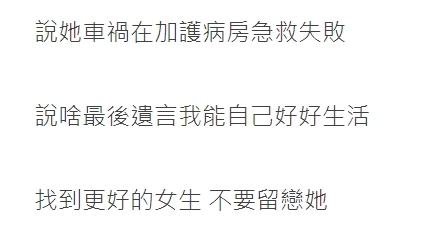 一名男網友分享他與前度女友的故事,本以為是悲傷的經歷,結果卻令網友們不禁爆笑?!樓主表示自己與女友交往3年,有一天女友的姐姐通知他很不幸的消息。女友遭遇車禍,在加護病房急救失敗,已經離世。臨終前還交代遺言,希望樓主可以自己好好生活下去,找到更好的女生陪伴他,還強調千萬不要留戀她。