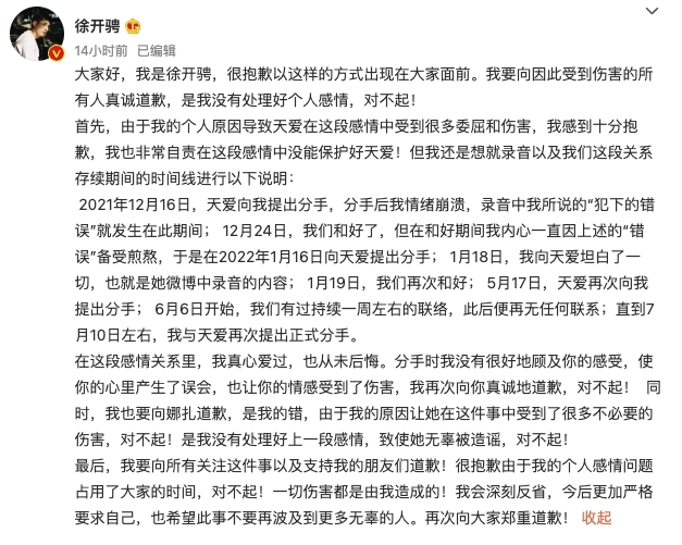隨後徐開騁公開道歉,承認酒後亂性等,但強調跟古力娜扎在一起的時候,就已經跟張天愛分手,並且向兩名前現任道歉。不過徐開騁自己交出的「時間線」,被網民發現徐開騁與古力娜扎拍拖的時候,似乎與張天愛拍拖時間線有重疊,至少也是無縫接軌!
