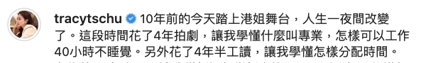 曾在《2012年度香港小姐競選》中取得季軍的朱千雪,近日慶祝入行10週年,Po文與粉絲感性地回顧這十年!她指當年港姐入行後人生一夜之間就改變了,曾有四年不斷拍劇的她指自己學會了什麼叫專業,更自爆工時超長:「(學懂了)怎樣可以工作40小時不睡覺。」聽起來相當辛苦但又滿足!