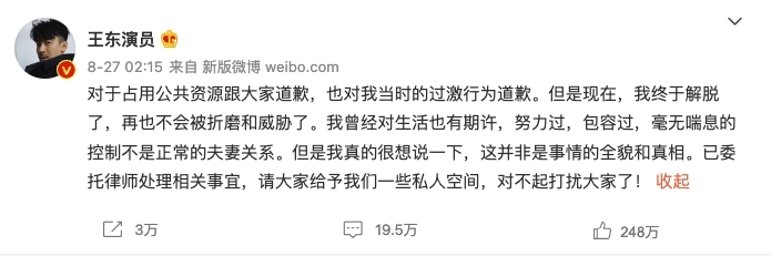 其後王東在網上發出聲明,為當時的「過激行為」道歉,不過他暗示自己才是受害者。王東指自己受到折磨與威脅:「我曾經對生活也有期許,努力過,包容過,毫無喘息的控制不是正常的夫妻關係。」甚至說影片並非事情的全貌與真相,指事情已經交托律師處理。不過他的聲明並未平息網友們的怒火,反而認為他在狡辯:「你被威脅把老婆往死裡打?」「閉嘴吧家暴男」「你打了人,你解脫了?真有意思」「不管怎樣打人很有理嗎」