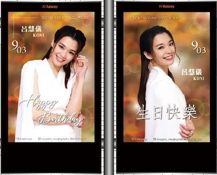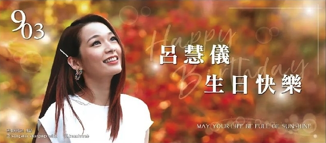 呂慧儀的粉絲一向都很捨得出錢出力,今年她的粉絲更斥資7萬為她大搞生日應援,給呂慧儀一個難忘的生日。一個名為「龔水充電站」的粉絲團在全港多區的巴士站燈箱、港鐵站燈箱買廣告祝賀呂慧儀生日,以多張呂慧儀的靚相做背景,再寫上「903呂慧儀生日快樂」,非常貼心!