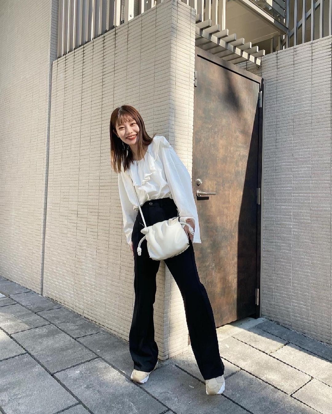 而且揀選直紋款、開衩款、直線皺褶等設計效果更佳!像這位 145 cm 高的日雜模特兒田中亜希子,日常就愛以高腰款的下身單品來拉長腰線和身型~