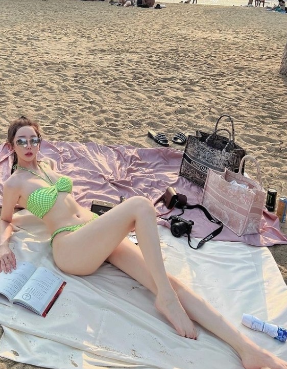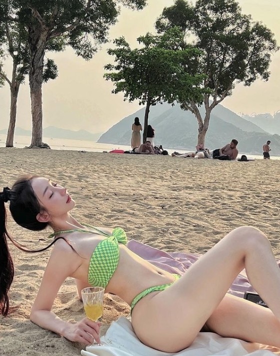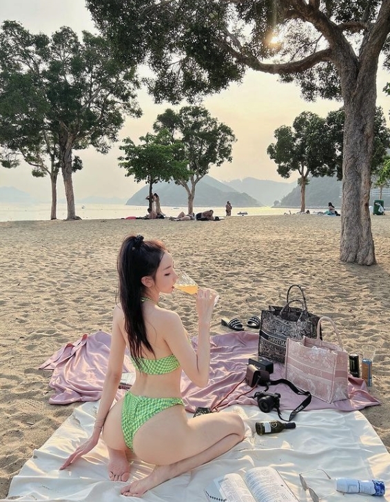近日,她在IG發布了一段影片,片中她在淺水灣海灘「打卡」,身穿綠色格仔紋比堅尼,頭扎高馬尾,展現白嫩皮膚、豐滿上圍,以及纖幼的四肢,身材極不科學。